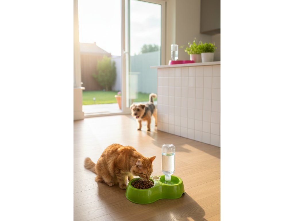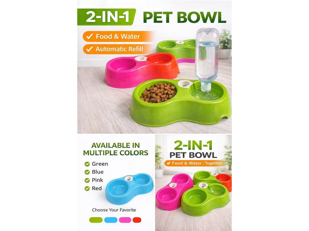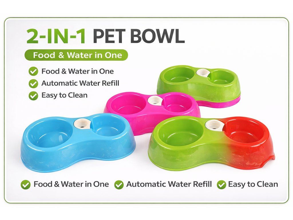 Miska obsahuje dva oddělené prostory – pro krmivo a vodu. Integrovaný systém umožňuje připojení běžné PET láhve, která automaticky doplňuje vodu podle potřeby.