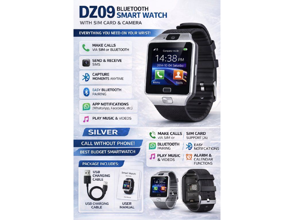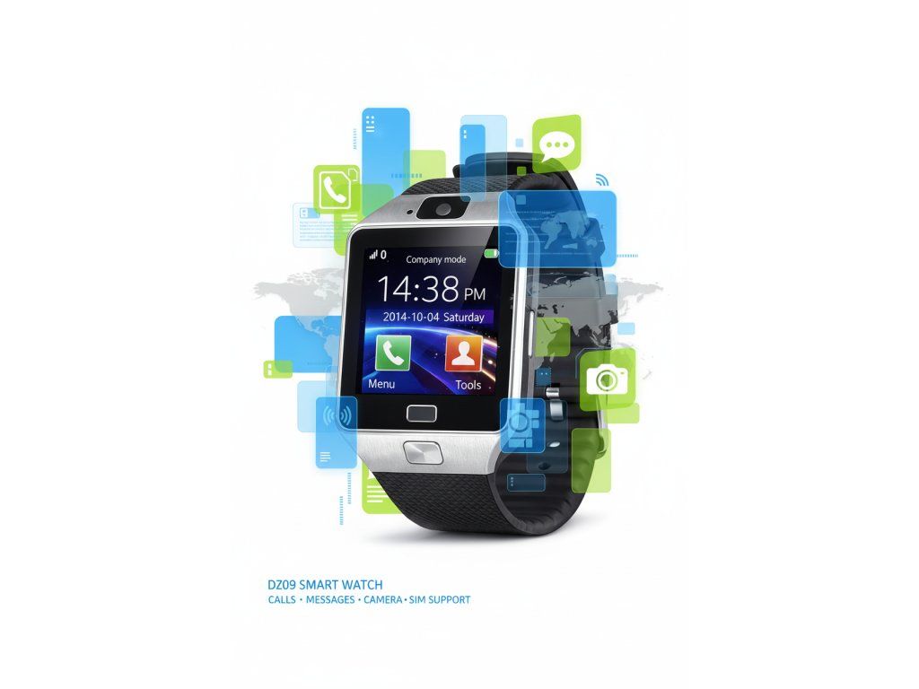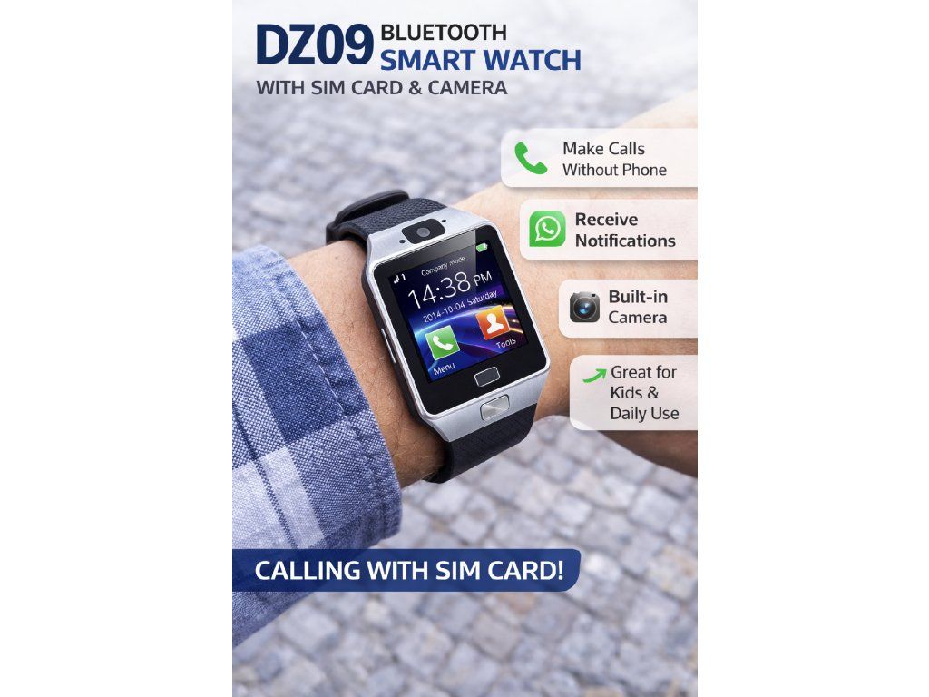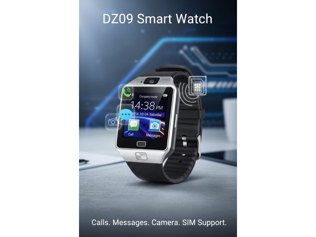Praktické chytré hodinky DZ09 s podporou SIM karty, kamerou a Bluetooth připojením. Ideální pro volání, zprávy i každodenní použití.