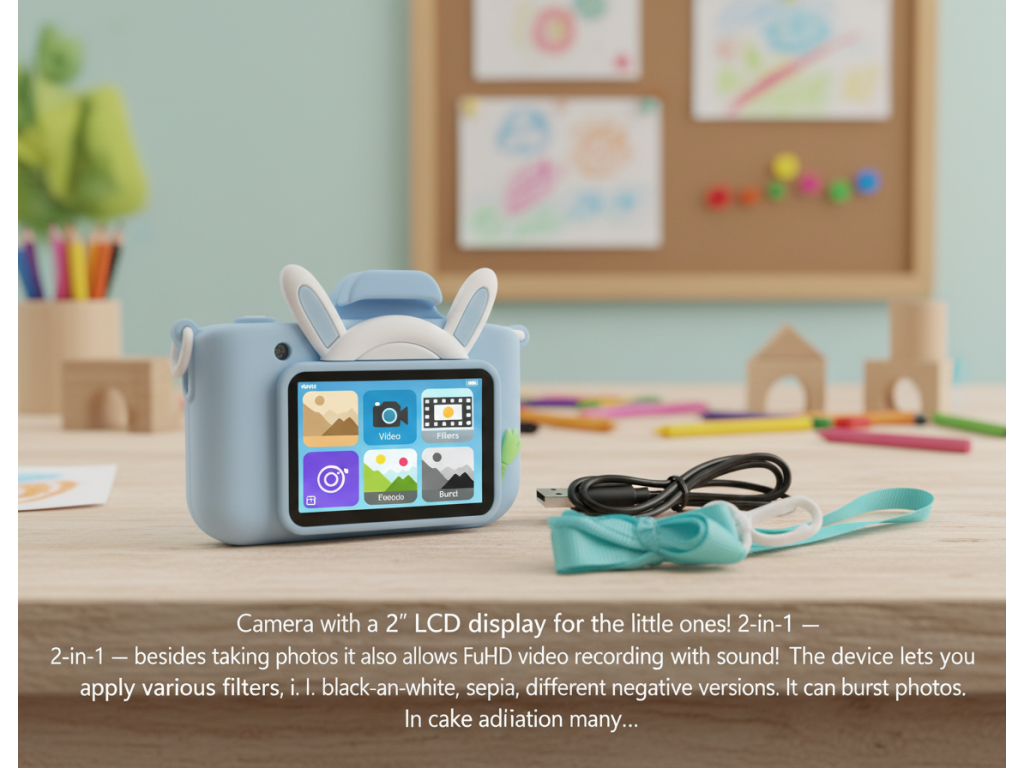 Kamera s 2" LCD displejem pro nejmenší! 2v1 - kromě pořizování snímků umožňuje také nahrávání ve Full HD se zvukem! Přístroj umožňuje aplikovat na fotografie různé filtry, tj. černobílé fotografie, sépie, různé verze negativu. Má možnost pořizovat sériové fotografie. Kromě toho je k dispozici mnoho rámečků, které se budou líbit každému batoleti, jako jsou hračky, narozeninové balónky, medvěd se včelami, mraky a mnoho dalších. Díky snadnému použití a vysoké kvalitě pořizování fotografií a videí bude vaše dítě rozvíjet kreativitu a umělecké cítění a zároveň se skvěle bavit.