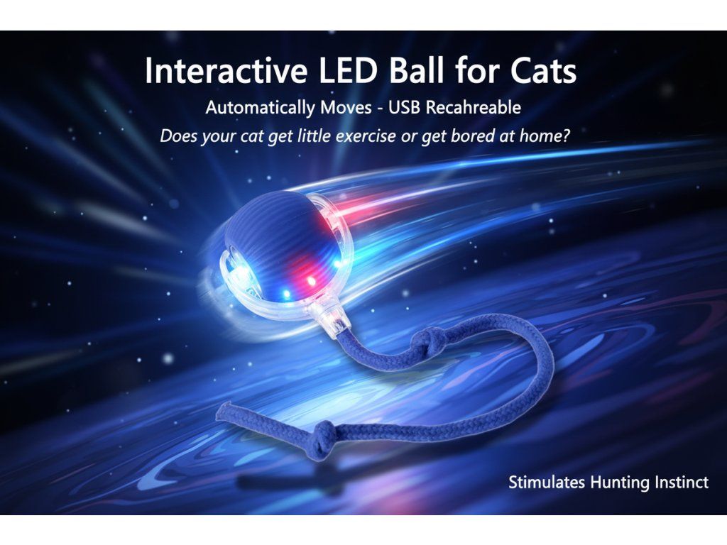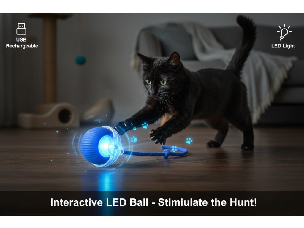 Interaktivní LED míček pro kočky, který se automaticky pohybuje při dotyku a stimuluje lovecký instinkt. USB dobíjení, odolné provedení a zábava i ve tmě.