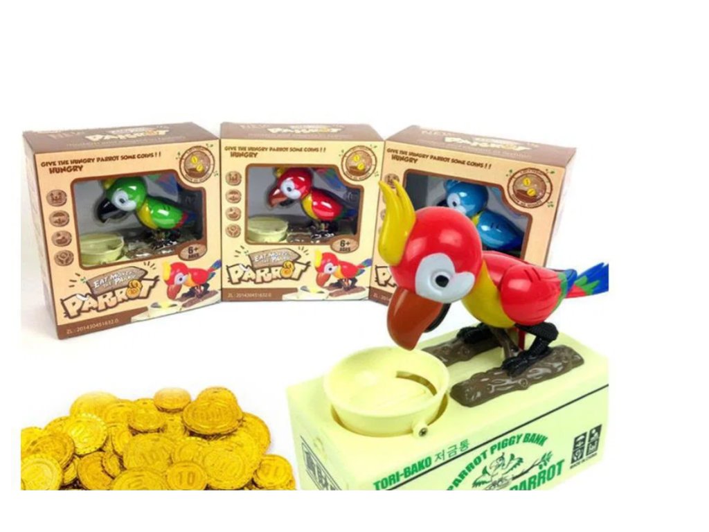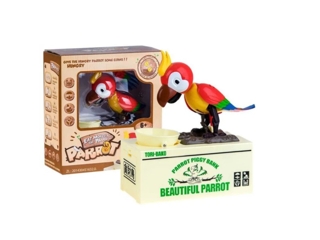 Po vhození mince do otvoru pokladničky, v tomto případě misky na jídlo, papoušek stojící nad ní začne vyvádět skutečné psí kusy. Vrtět se, „hltat" vhozený peníz a honit ho kolem dokola misky.