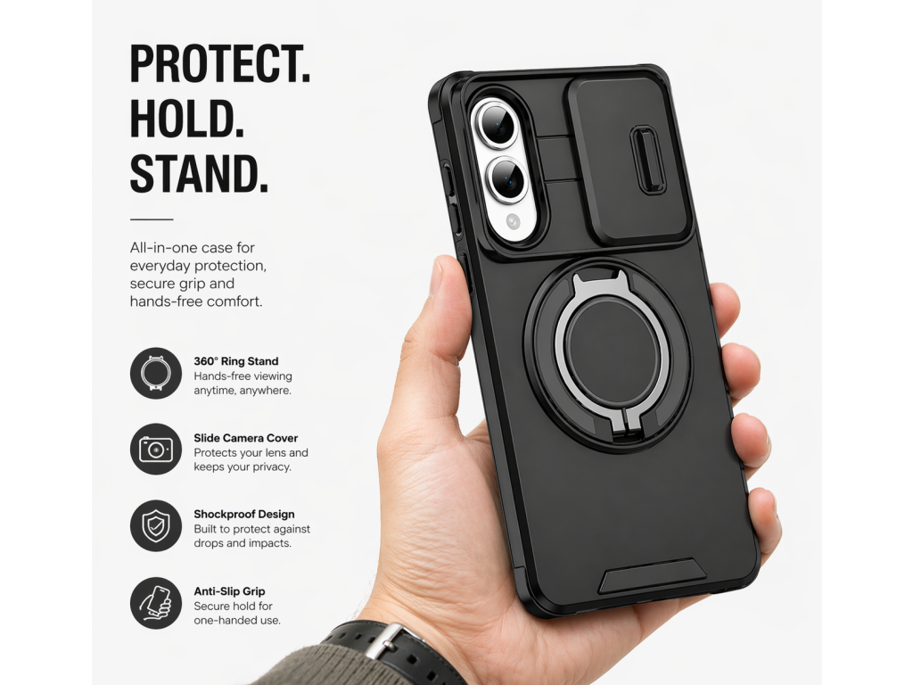 Díky integrovanému kovovému kroužku získáte pevný úchop a možnost pohodlného používání jednou rukou. Kroužek zároveň slouží jako praktický stojánek ideální pro sledování videí, videohovory nebo práci.