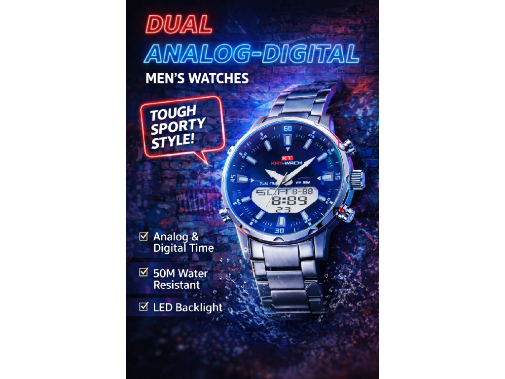 Stylové pánské hodinky kombinující klasický analogový ciferník s digitálním displejem. Ideální pro každodenní nošení i sportovní aktivity.