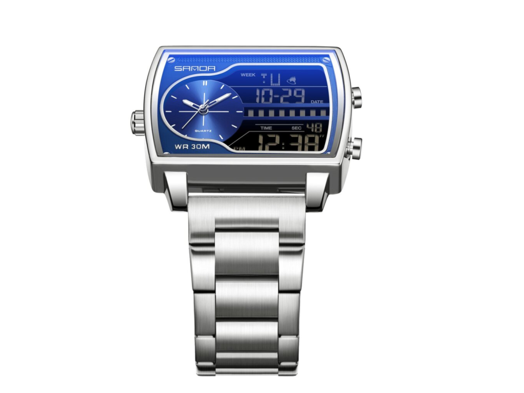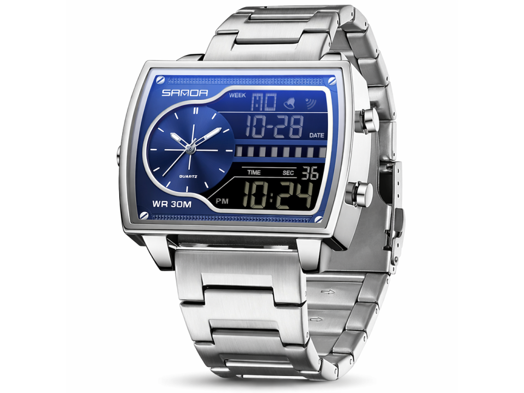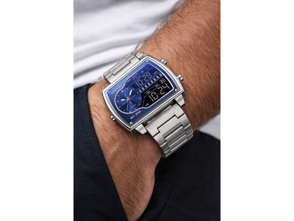 Pánské hodinky SANDA 6163 – analog + digitální, ocelový řemínek, retro hranatý design, voděodolné 3ATM