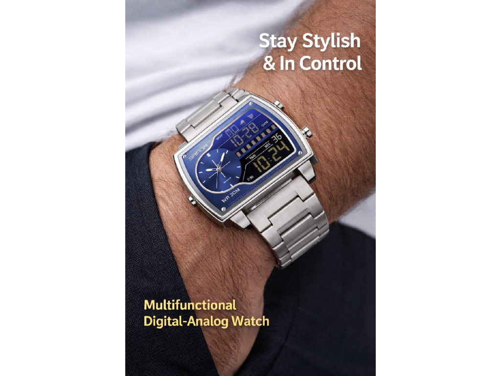 Moderní pánské hodinky s retro hranatým designem kombinující analogový ciferník a digitální displej. Odolné, stylové a ideální pro každodenní nošení.