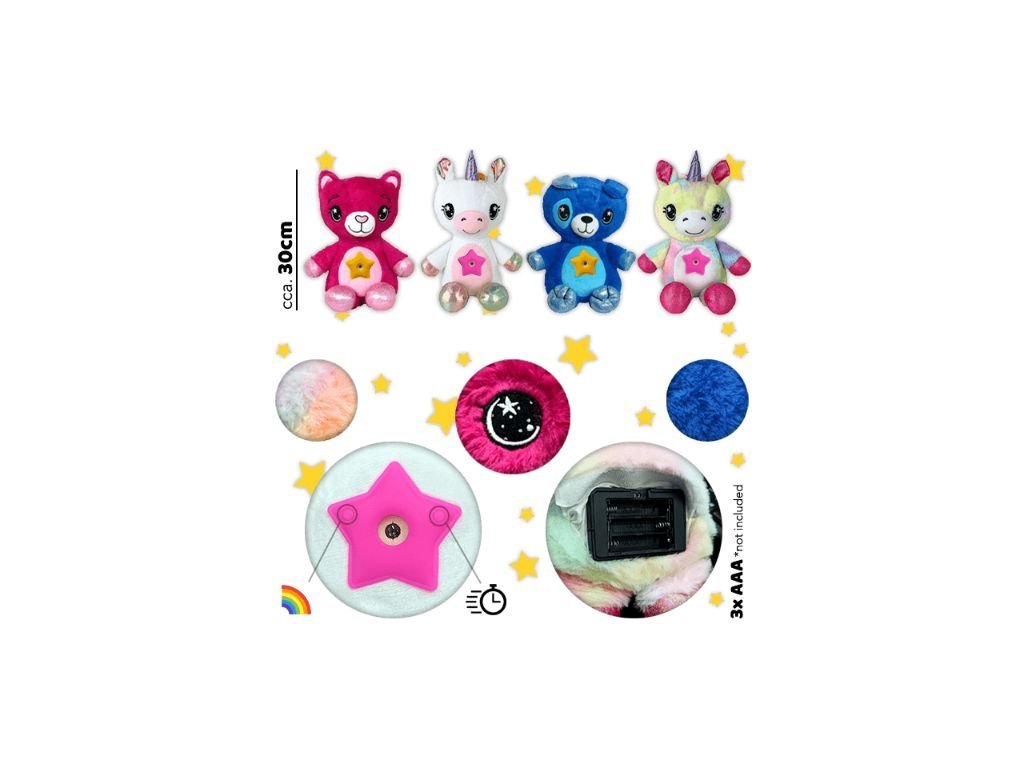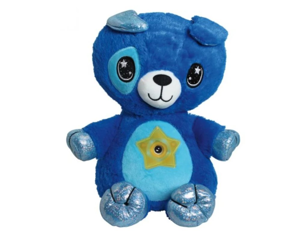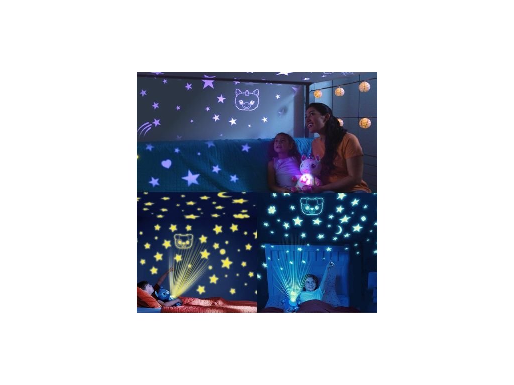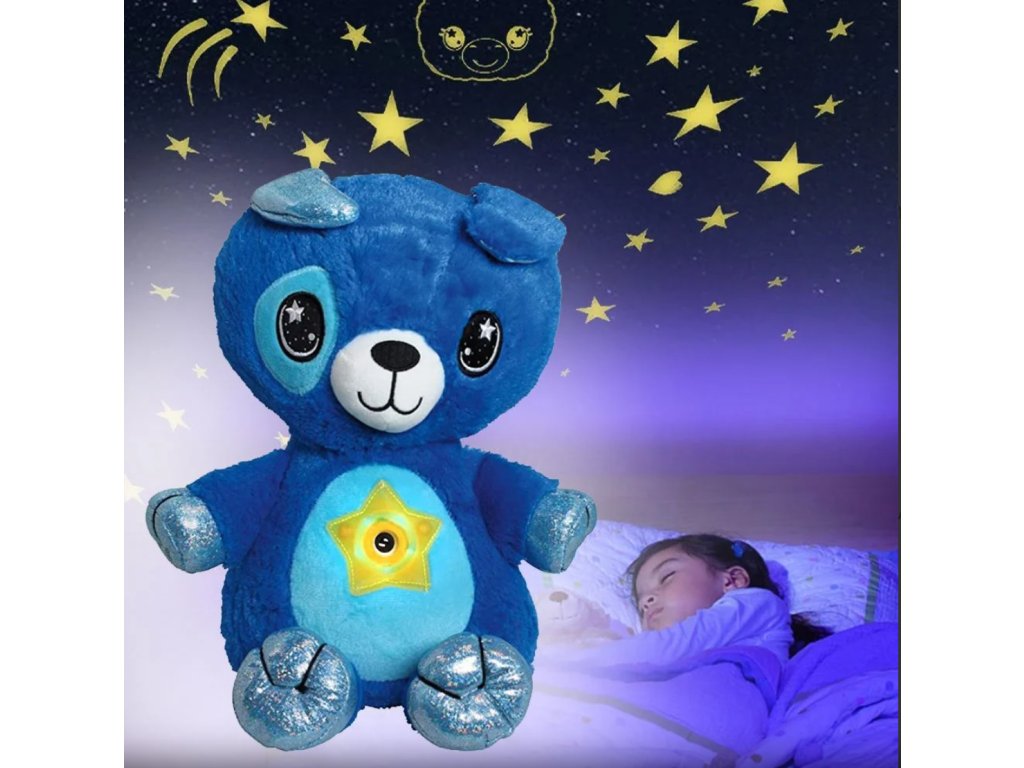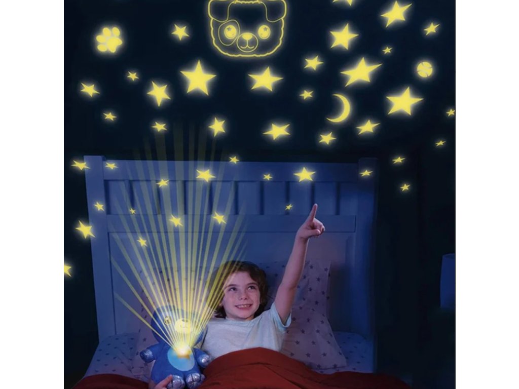 Plyšový projektor je skvělý pomocník při usínání. Děti tak snadno překonají strach ze tmy. Projektor je schovaný v bříšku plyšáka a vyčaruje hvězdné a pohyblivé nebe na zdi. Na plyšákovi lze nastavit barvy i rotaci promítání.