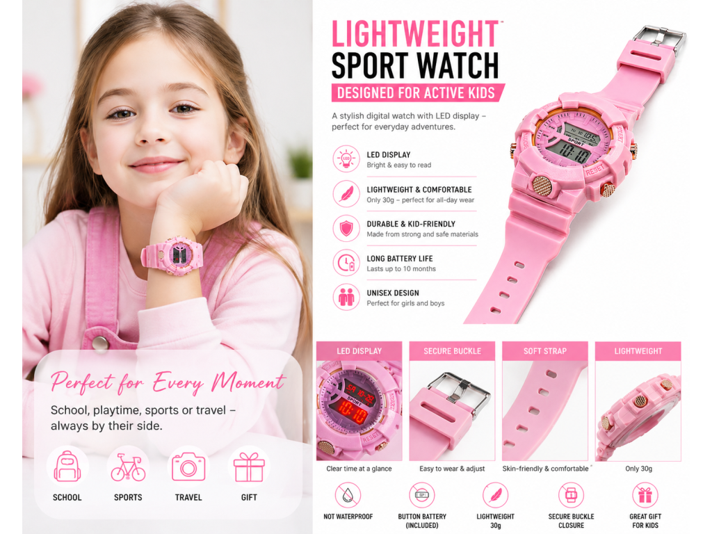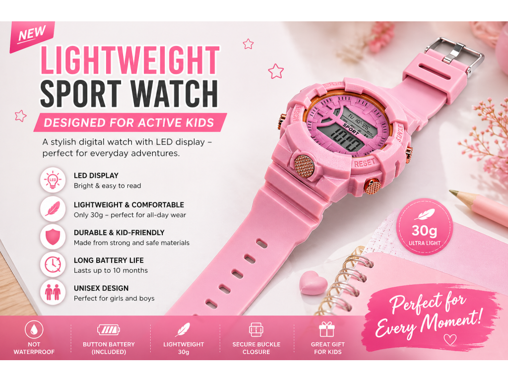 Tyto dětské digitální hodinky jsou ideální volbou pro každodenní použití. Nabízejí praktické funkce, jednoduché ovládání a lehkou konstrukci, díky které jsou pohodlné i při celodenním nošení.