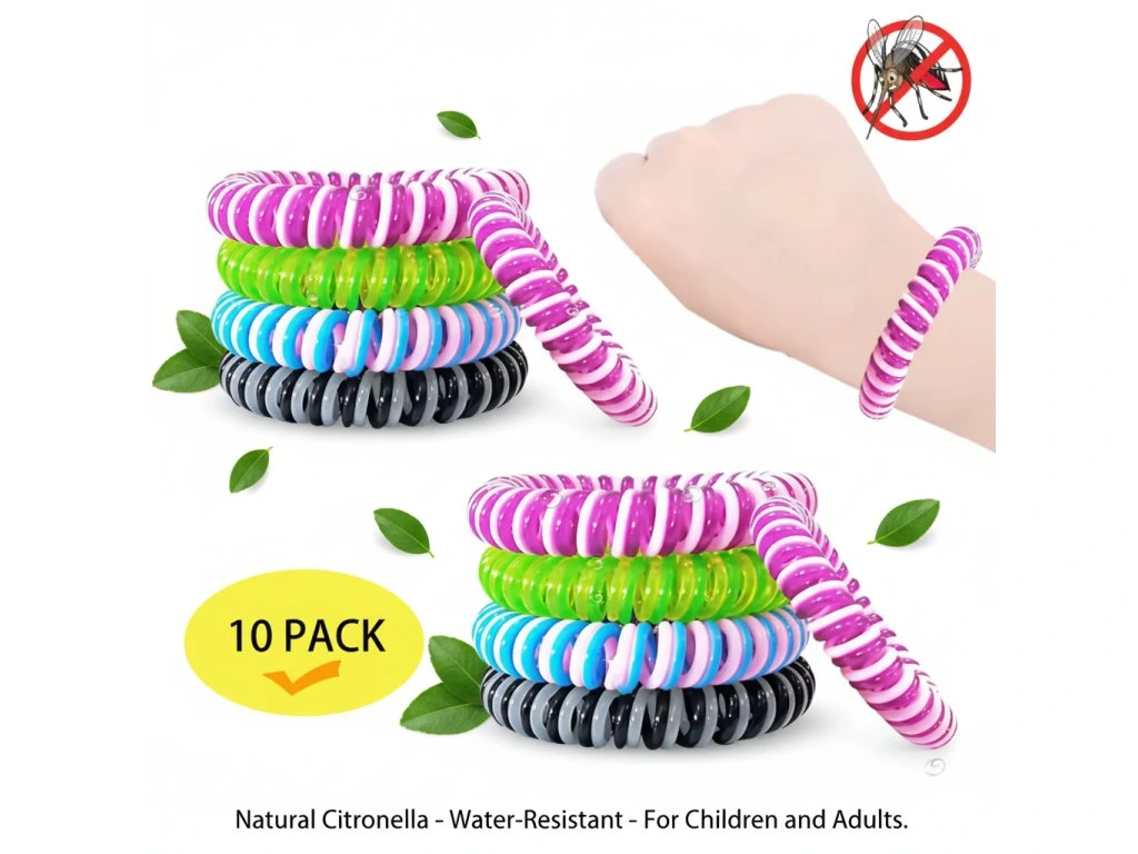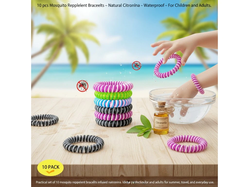 Praktická sada 10 náramků proti komárům s přírodní citronellou. Ideální ochrana pro děti i dospělé na léto, cestování i každodenní použití.
