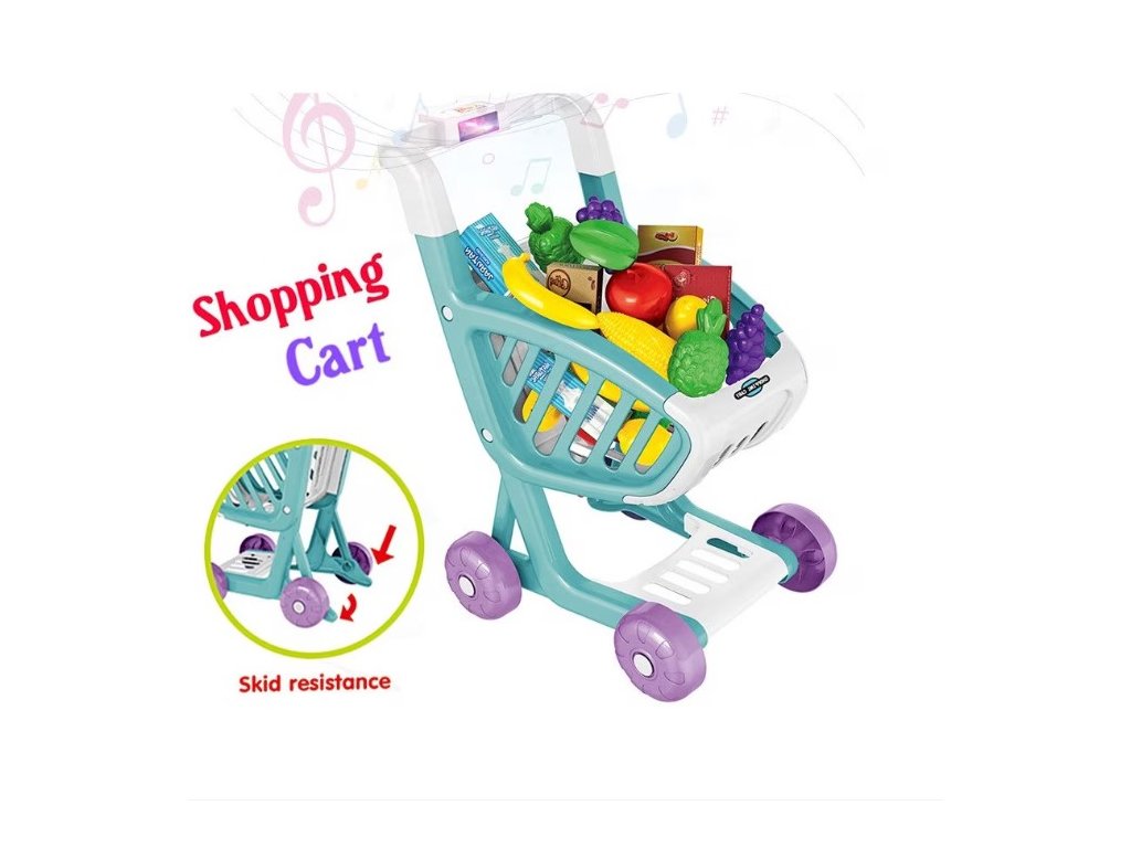 Tyrkysově modrý dětský nákupní vozík se světly, zvuky a realistickými doplňky je perfektní hračkou pro malé milovníky nakupování i hraní na obchod.