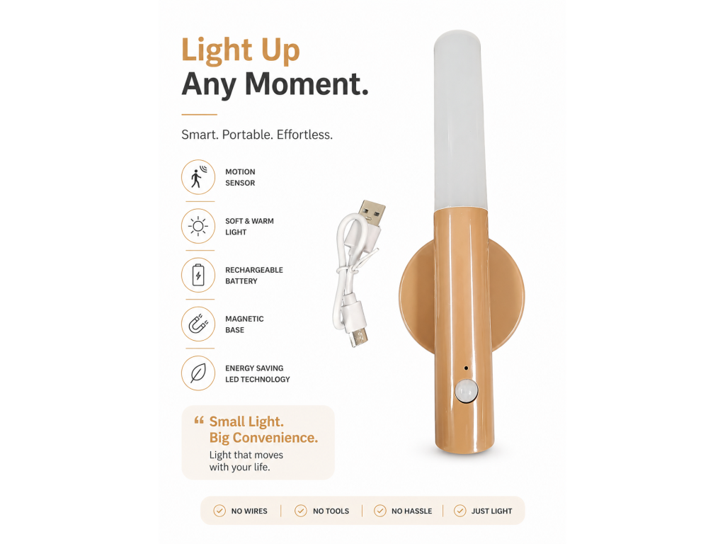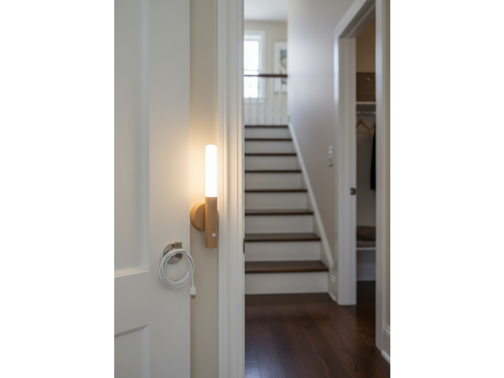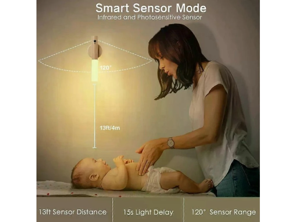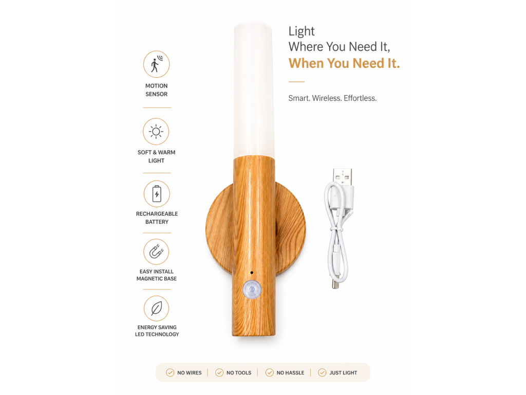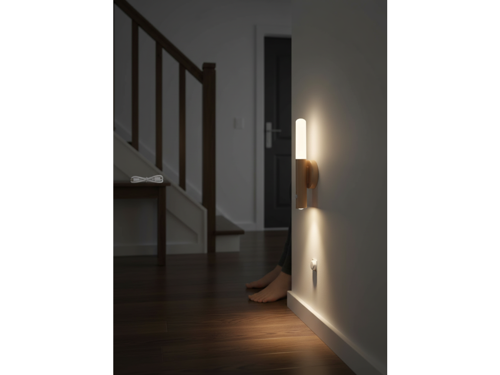 Moderní LED noční světlo s pohybovým senzorem, které se automaticky zapne ve tmě. Díky magnetickému uchycení a dobíjecí baterii jej snadno umístíte kamkoliv bez kabelů. Ideální pro chodby, ložnice, schodiště nebo skříně.